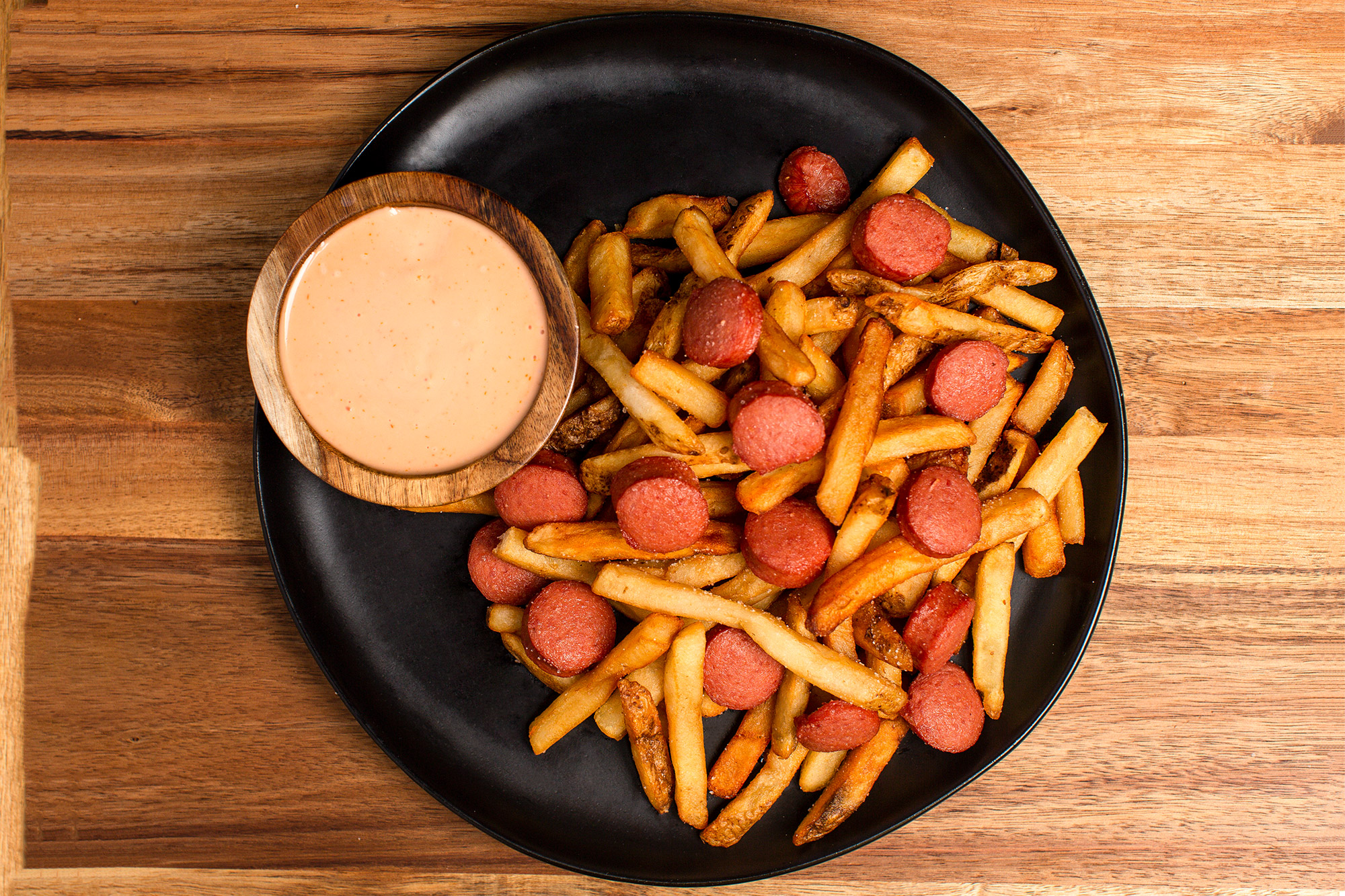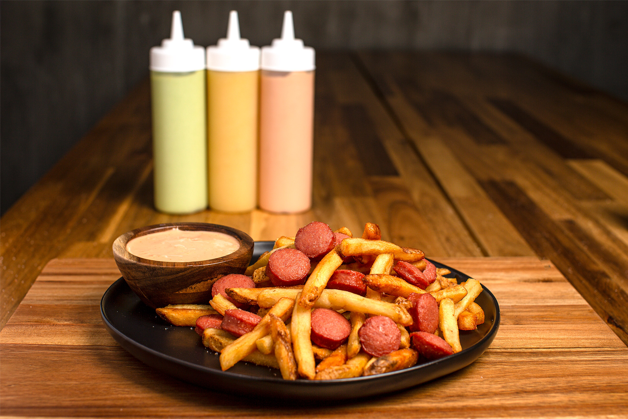 Salchipapas consist of thinly sliced deep fry all-beef sausages and