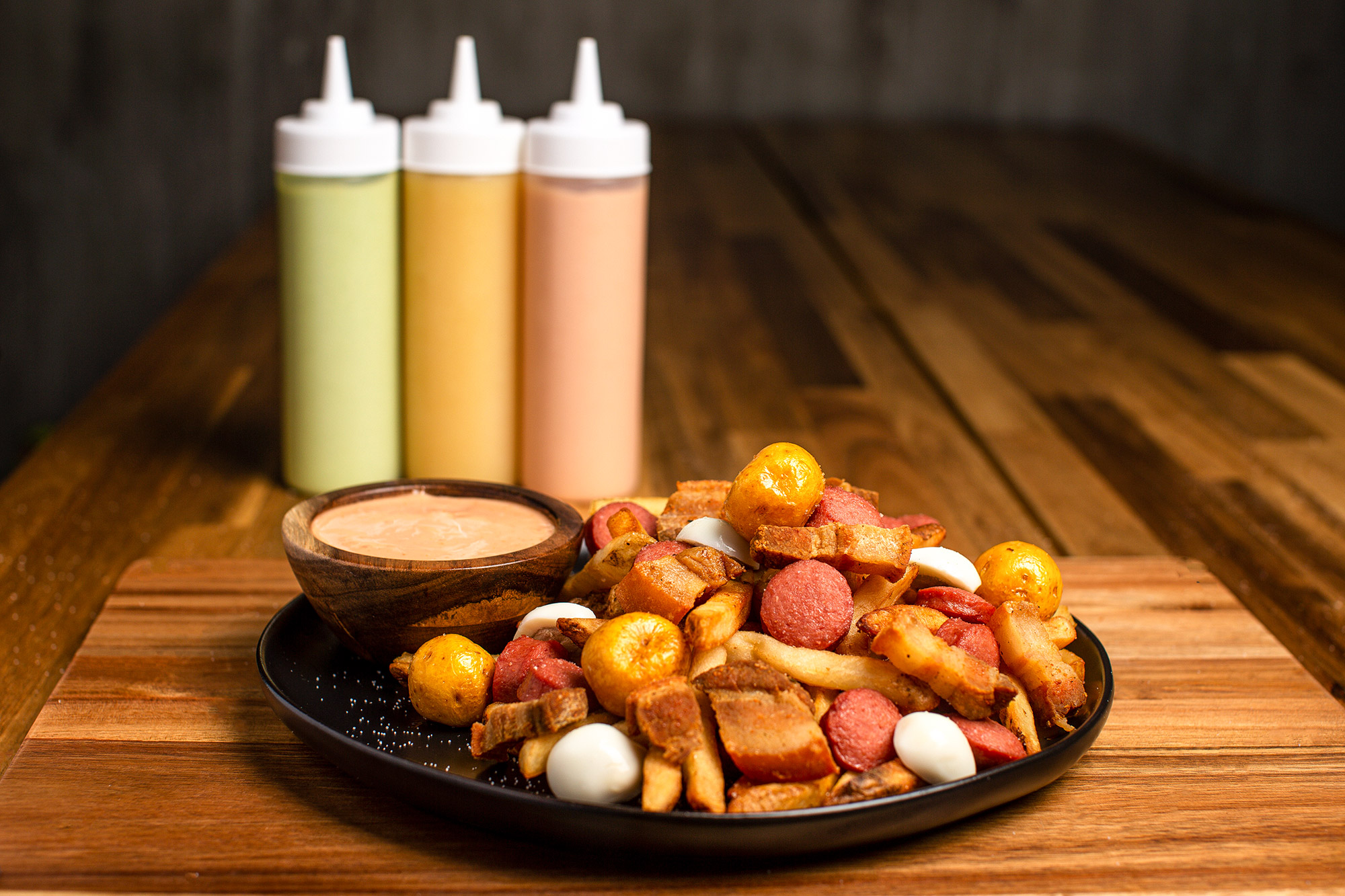 Imagine A mix of 3 Countries dish of imported Papas Criollas from Colombia potatoes The delicious all-beef American hot dog and our skin on Special “French” Fries makes combination of crazy flavor between these countries and it just gets better when you take this and tossed it around with mini pork bites and top it with delicious quail eggs